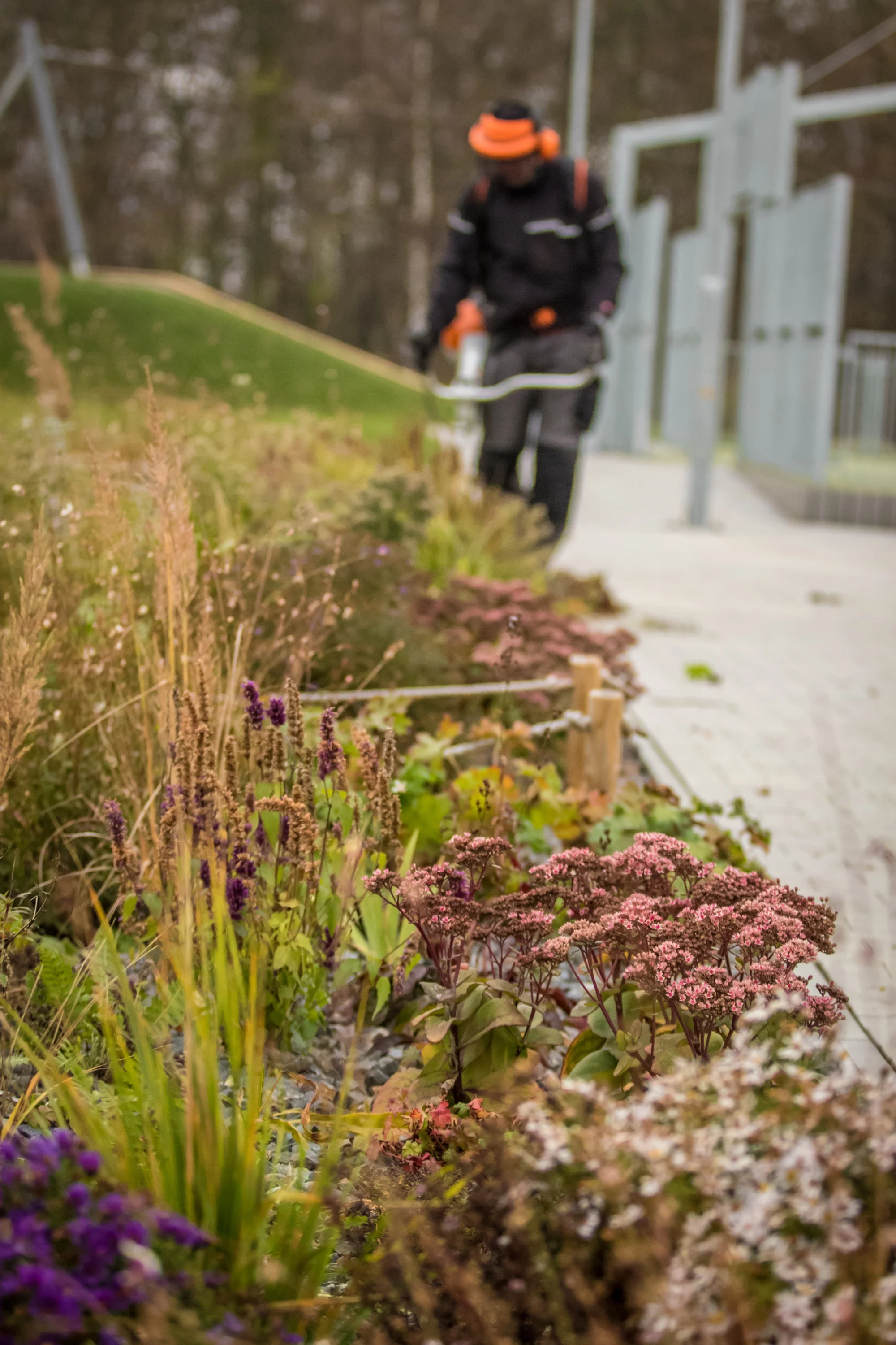 Trvalky v záhonech u hřiště v Ostravě za půl roku krásně narostly a zhoustly. Přestože záhony, díky správné kombinaci rostlin a použití štěrku jako mulče, vyžadují údržby jen málo, některým pracím se nelze vyhnout ani tak. Záhony jsme v průběhu roku dvakrát pleli od náletu jednoletých plevelů z okolí. Nyní na podzim přichází na řadu pokosení záhonu. Tento úkon připadá standardně až na konec února, ale kvůli plánované výsadbě cibulovin přišel na řadu již teď.